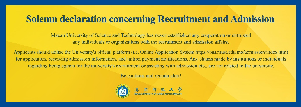 The university encourages students to pursue their studies diligently and provides a generous range of scholarships for postgraduate applicants. These scholarships include the following categories: 1. Outstanding Academic Achievement Scholarship; 2. Postgraduate Studentships (PGS); 3. Scholarships for Sports and Arts Elite;4. Wynn Resorts (Macau) S.A. Scholarship for Overseas Studies. After admission, the applicant will also have the opportunity to obtain an institutional scholarship. More information: https://sgs.must.edu.mo/page/scholarships.html