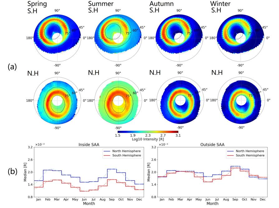 在SAA影響下極光强度季節性的分佈及變化趨勢