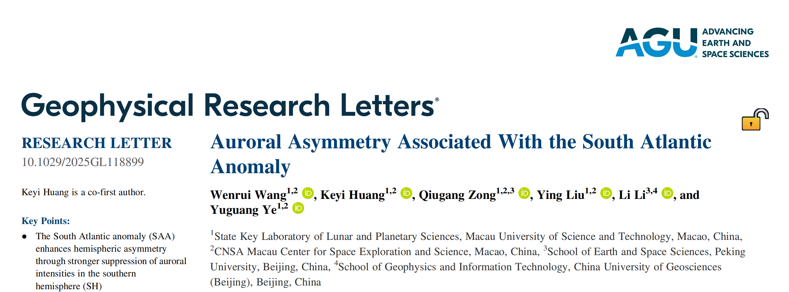 近日,澳門科技大學月球與行星科學全國重點實驗室博士生黃可怡與其指導教師王文睿助理教授、宗秋剛講座教授通過分析衛星數據,發現了南大西洋異常區(South Atlantic Anomaly, SAA)對地球極光活動的調製效應,相關成果發表在地球科學領域的國際頂級期刊Geophysical Research Letters上。該論文以澳科大為第一完成單位。