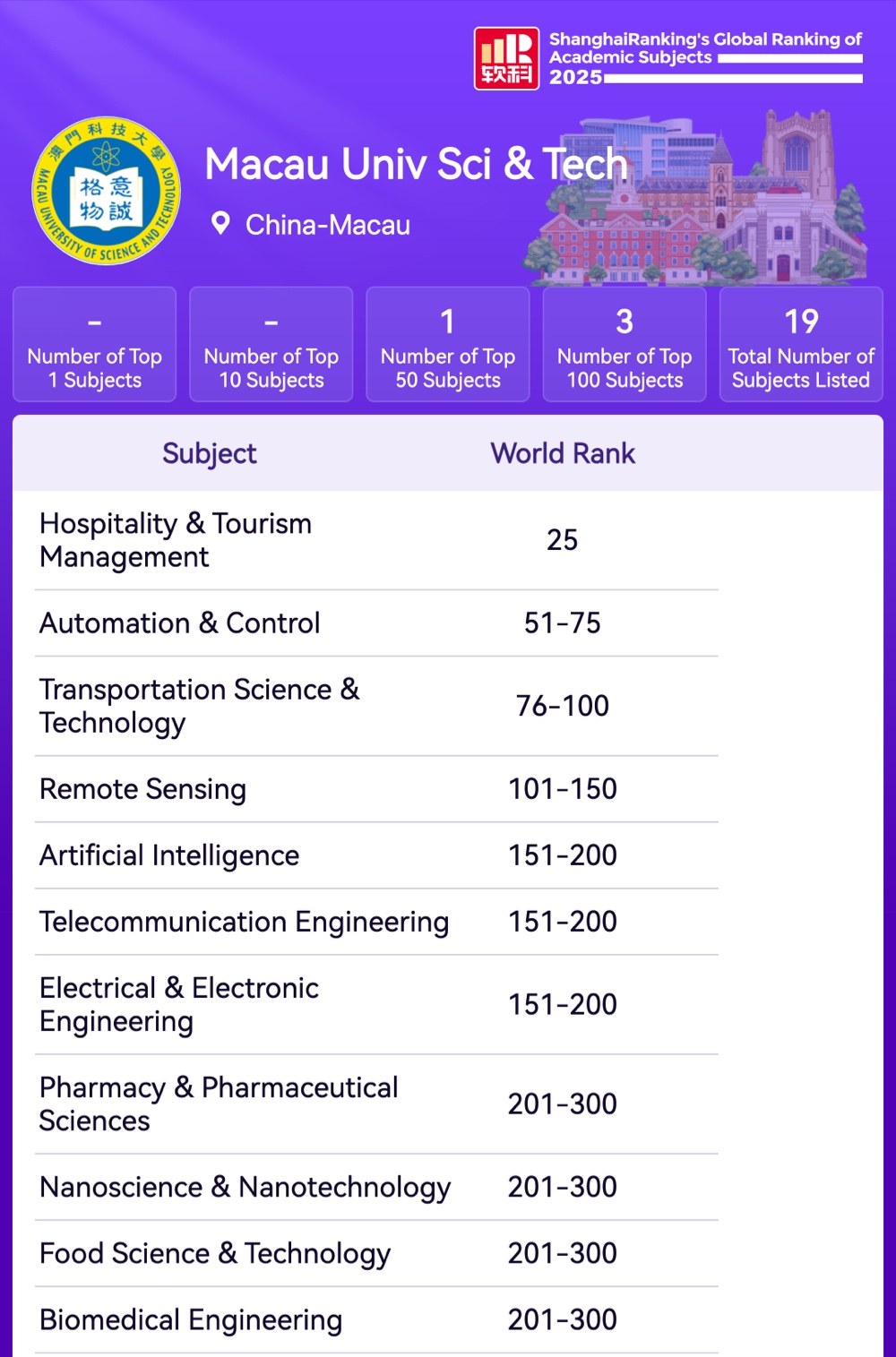 2025年11月18日,上海軟科發佈「2025世界一流學科排名」(ShanghaiRanking's Global Ranking of Academic Subjects),澳門科技大學表現突出,共有19個學科上榜,較去年新增7個學科。其中旅遊休閒管理學科(Hospitality & Tourism Management)表現尤為亮眼,排名提升至全球第25名。新增7個學科分別為遙感技術、人工智能、生物醫學工程、食品科學與工程、能源科學與工程、工商管理、管理學,展現其學科佈局的持續拓展與優化。