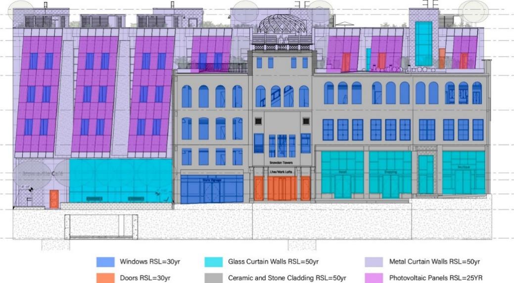 按參考使用壽命(RSL)劃分的Snowdon大樓建築外立面材料分類圖