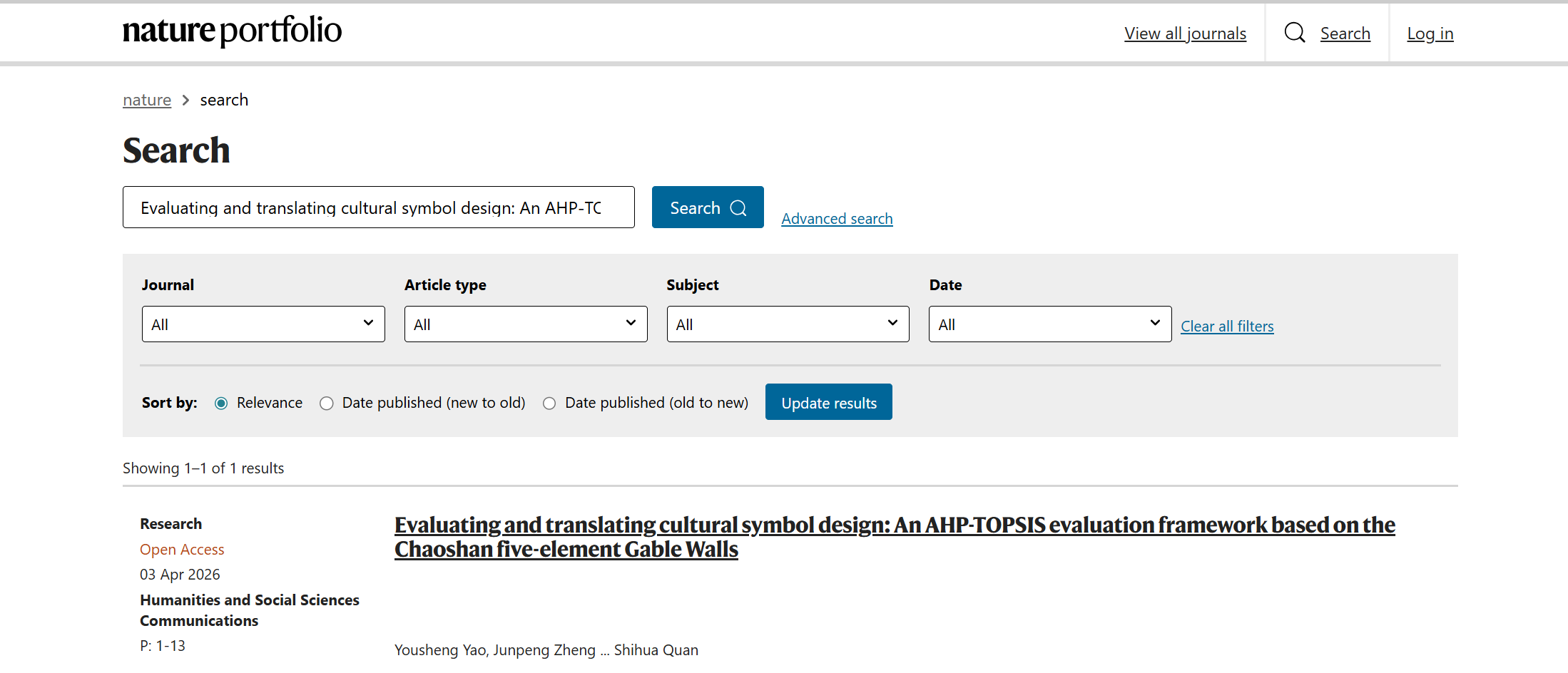 2026年4月3日,澳门科技大学人文艺术学院2022级博士生尧优生在文化符号设计的评估与转译领域研究取得重要突破,相关成果以Evaluating and translating cultural symbol design: An AHP-TOPSIS evaluation framework based on the Chaoshan Five-Element Gable Walls为题,发表于国际顶级学术期刊Nature旗下唯一人文社科综合类核心期刊Humanities & Social Sciences Communications。在人文和社会科学分区均为Q1,在全球265种交叉学科社会科学类期刊中排名第一,在全球人文社科领域具有影响力。