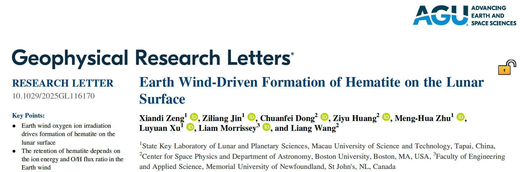 上述研究成果以題目為Effects of Crystal Orientation and Temperature on Space Irradiation of Silicates和Earth Wind‐Driven Formation of Hematite on the Lunar Surface,分別發表在國際空間與地球物理權威期刊the Astrophysical JournalGeophysical Research Letters上。此外,Nature新聞編輯部以題目:“The Moon is rusting — thanks to ‘wind’ blown all the way from Earth” 針對月表強氧化的研究發表專訪報道,獲得學界及大眾廣泛關注。參與研究的合作者包括澳科大的祝夢華教授,北京航空航天大學的徐璐媛副教授,美國亞利桑那州立大學Maitrayee Bose和Richard Hervig教授,中國地質科學院地質研究所龍濤研究員,美國Boston University的董川飛教授、黃子鈺和王亮博士,及加拿大Memorial University of Newfoundland的Liam Morrissey教授等。
