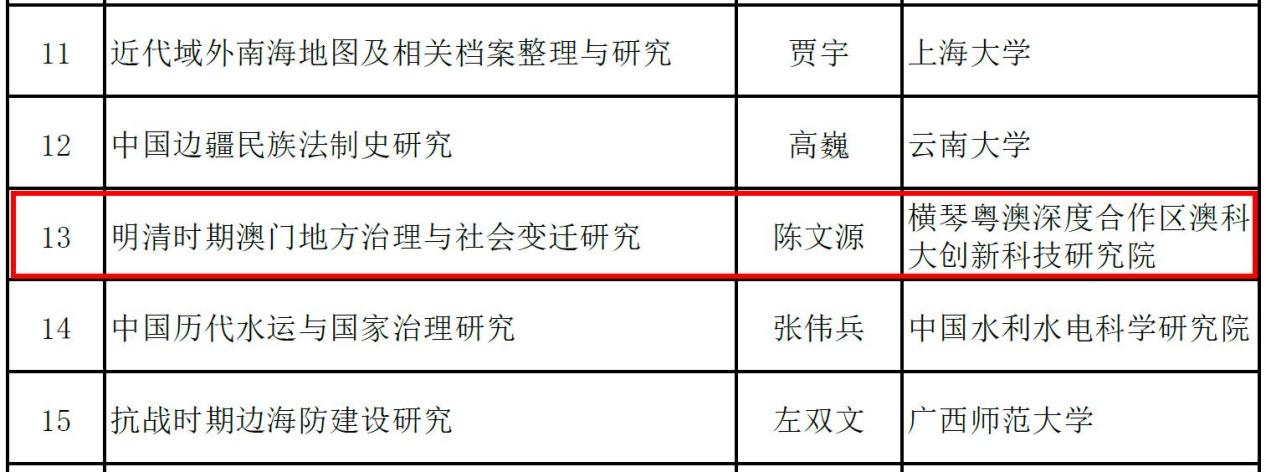 澳科大社文所陳文源教授獲澳門地區首個國家社科基金中國歷史研究院