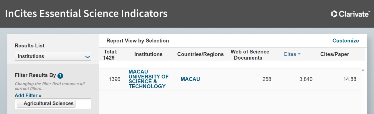 澳科大農學進入ESI(基本科學指標)前1%學科數據截圖