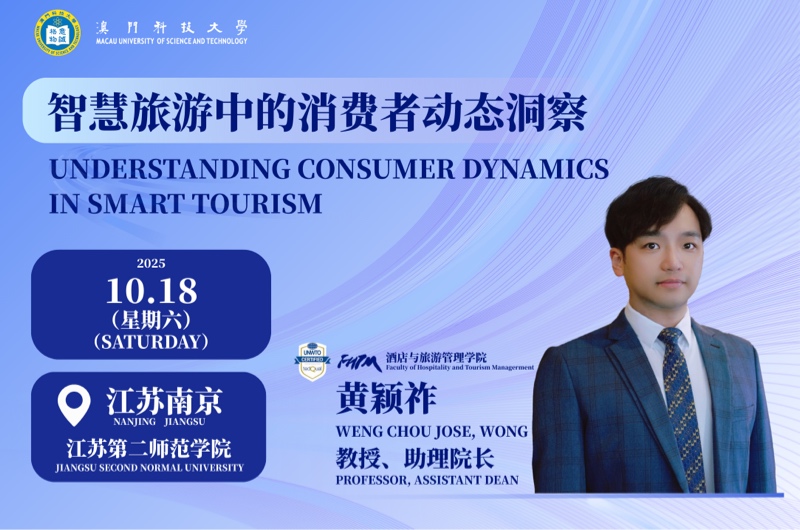 Speaker’s Profile: Dr. Jose Wong, Assistant Dean and Professor at the Faculty of Hospitality and Tourism Management, Macau University of Science and Technology, has expertise in smart tourism, risk management, and tourist experience. Over the past five years, he has published more than 40 SSCI/SCI papers, three of which are ESI Highly Cited. He has received two awards from the Macao SAR Government for outstanding humanities and social science research, and two university-level research prizes. Currently serving as Associate Editor and Editorial board member for several SSCI Q1 journals, he is also President of the Shanghai Jiao Tong University Alumni Association (Macau) and actively fosters industry–academia collaboration.