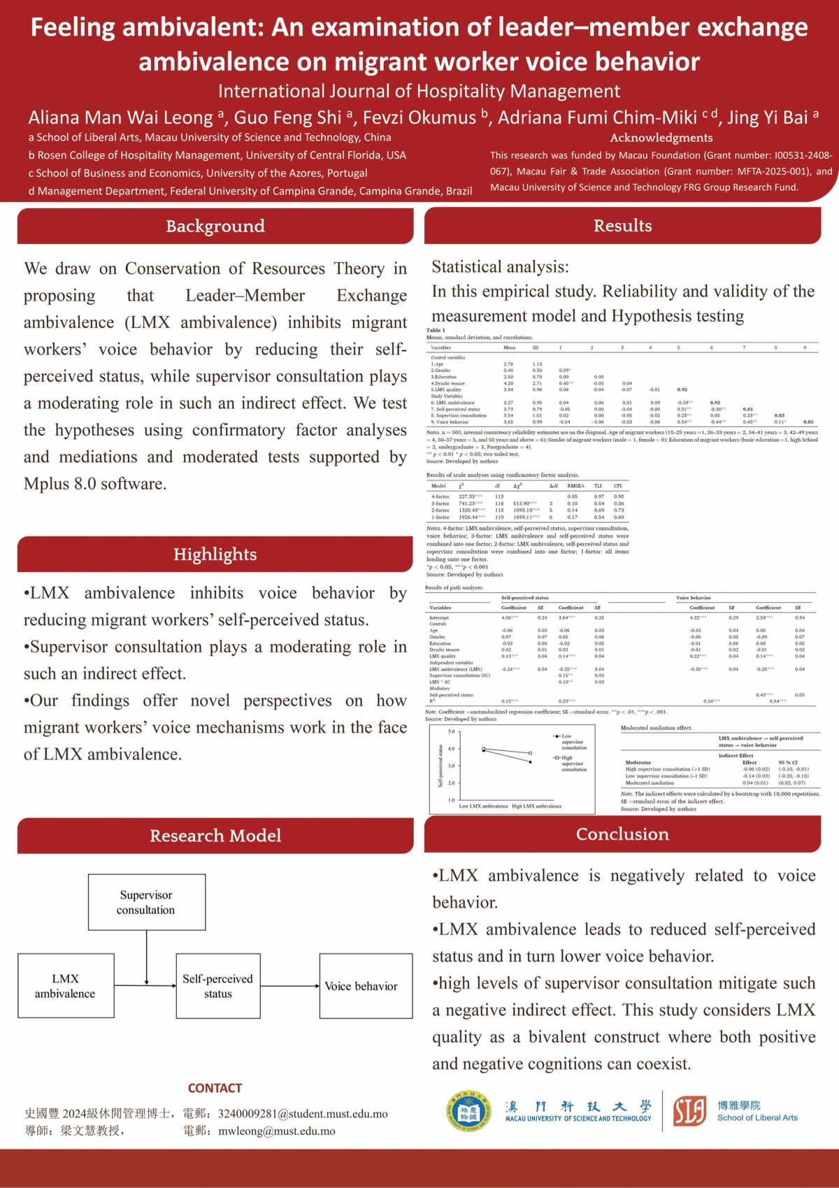 研究生優秀成果展匯聚澳科大不同學院及研究所研究生的優秀學術課題與成果,以海報、書籍等多元形式線上展示,讓各界人士深入了解澳科大不同領域的研究課題及成果,促進跨學科交流。展期: 2026年3月2日起地點: 線上澳科大研究生培養簡報(2021-2025)參展者名單王羿赫 酒店與旅遊管理學院戴安娜 酒店與旅遊管理學院馮俏彥 酒店與旅遊管理學院張岳天 酒店與旅遊管理學院朱志勇;李瑾皓 國際學院任麗 國際學院許雲鳳;劉榮艶 國際學院史國豐 博雅學院王倩 醫學院黃海波 醫學院張璐 醫學院吳雪嵐 醫學院李昭儀 醫學院-藥學院,中藥機制與質量全國重點實驗室歐可風 商學院陳俞樺 商學院陳欣媛 法學院陳思楊 法學院劉堯 中醫藥學院李雅琴 中醫藥學院柯昱 社會和文化研究所吳一怡 社會和文化研究所陳靜 社會和文化研究所劉人瑞、趙斯哲 月球與行星科學全國重點實驗室黃可怡 月球與行星科學全國重點實驗室孟新棟 月球與行星科學全國重點實驗室黃揚 可持續發展研究所宋方舟 可持續發展研究所魏玲 可持續發展研究所林中傑 創新工程學院陸穎儀 創新工程學院李嵐澤 創新工程學院許全星 創新工程學院林融 人文藝術學院王凱陽 人文藝術學院毛悅; 張旭 人文藝術學院許婧 人文藝術學院李怡靜 人文藝術學院楊超 人文藝術學院麥晟 人文藝術學院殷健強 人文藝術學院陳佐銘 人文藝術學院 往期展覽:2025年研究生優秀成果展......
